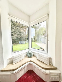 Dining / Living - 3.65m x 3.5m Located in the centre of this gorgeous home is the living / dining room, right at the hub of all things. The room is open to the sitting room and has direct access to the kitchen and double doors to the down-stairs bedroom. The room is covered with a quality carpeted flooring for that cosy feeling with a tilt and turn bay window with seating and storage, giving the new owner a full view to the rear garden.