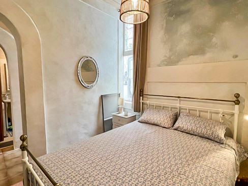 The double bedroom and bathroom with tub, sink and toilet are also located on the ground floor. The bedroom features an exposed archway entrance, which is a common feature in Cretan architecture, and tall sash windows that let in natural light and offer beautiful views of the surrounding area.