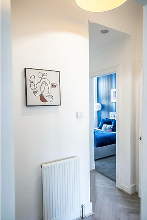 This property combines a light and spacious lounge, two bedrooms, a kitchen, and a shower room. The solid entry door leads into the communal hallway retaining its original features with the beautifully preserved stone stairs leading to the first floor. The apartment's hall opens into a stunning, contemporary, and exceptionally spacious lounge with a Bay window, with the focal point being a large mirror offering a heightened sense of space, light, and warmth.