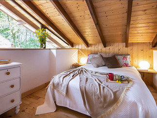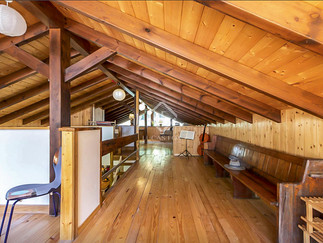 Stepping inside the main house, you'll find a rustic yet sophisticated “cabin in the woods” vibe. The open concept second floor has a lofted wood beam ceiling with huge windows, and contains two bedrooms, a study area, a bathroom, and a lounge.