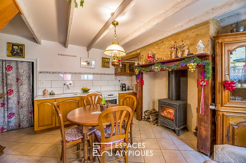 The house is in perfect order and offers loads of charm with wood beams, exposed stone, and wood burning fireplace. It's spread over three levels and includes a dine-in kitchen, a living room and small office nook, two bedrooms, a bathroom, a toilet room and a small cellar.